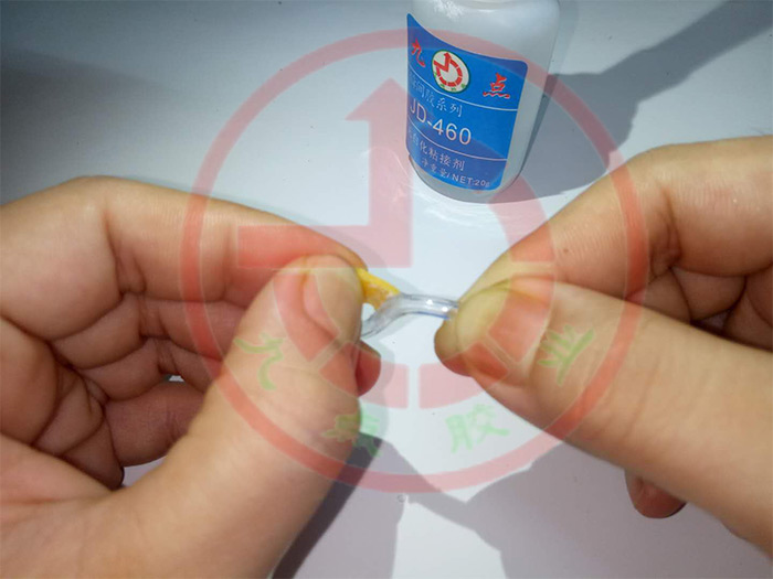 3、在被接著面滴一小滴接著劑,即刻進(jìn)行粘接,并保持至硬化為止,硬化時(shí)間從數(shù)秒到數(shù)分不等。約30分鐘即可達(dá)到實(shí)用強(qiáng)度,24小時(shí)后可得到最高強(qiáng)度。
