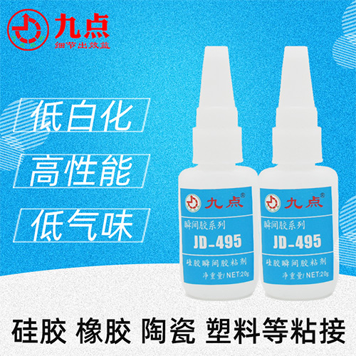 JD-495硅膠瞬間膠水單組分,施工便利。非常適合連續化生產線作業。具有高性能、低氣味、低白化、耐濕性等性能優異。硅膠粘接無白化快干膠屬于氰基丙烯酸甲基乙酯